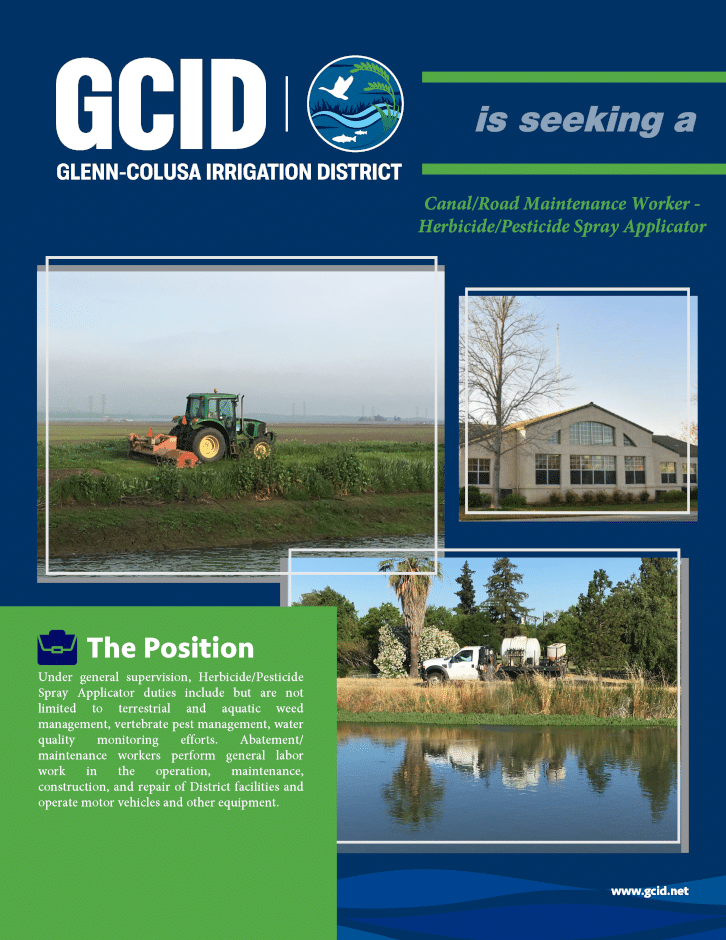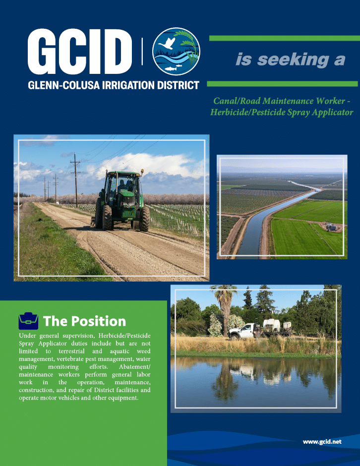 Application and detailed job descriptions are available at the Glenn-Colusa Irrigation District office; telephone 530-934-8881.
